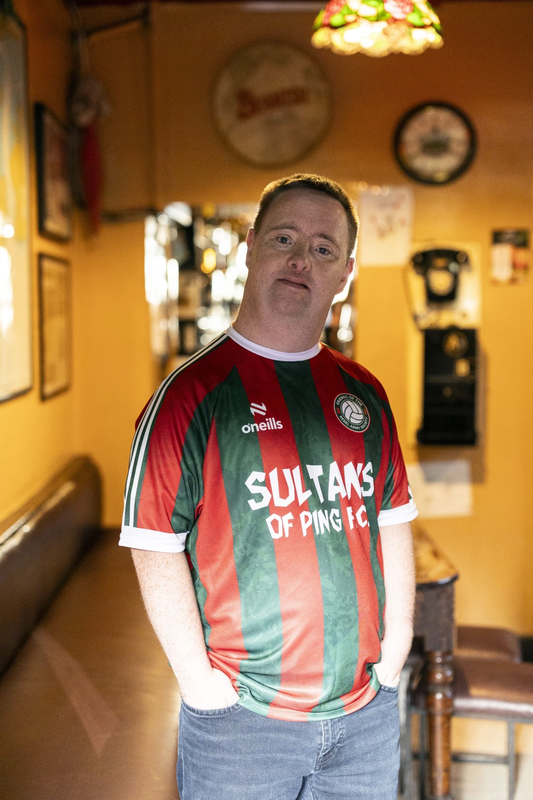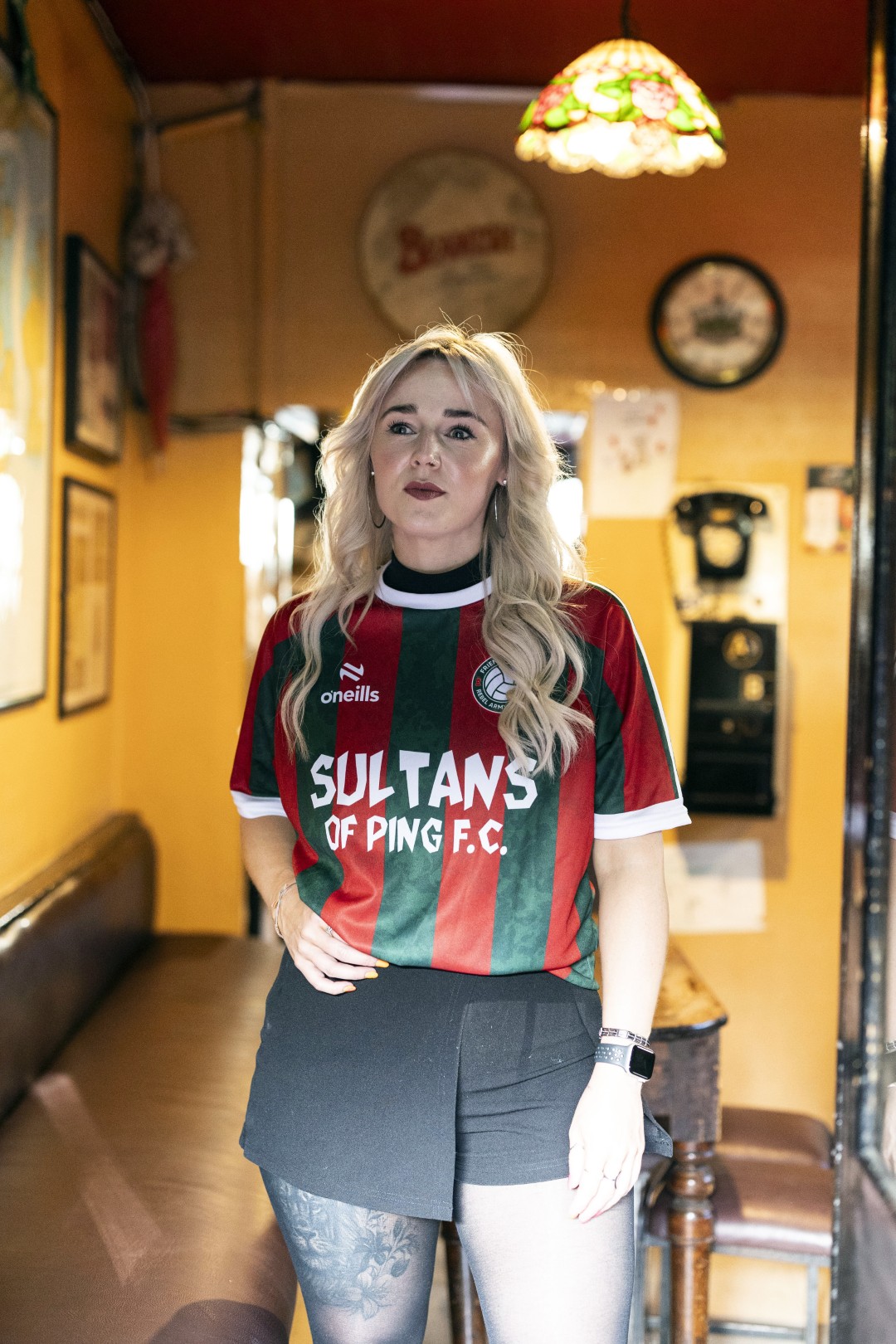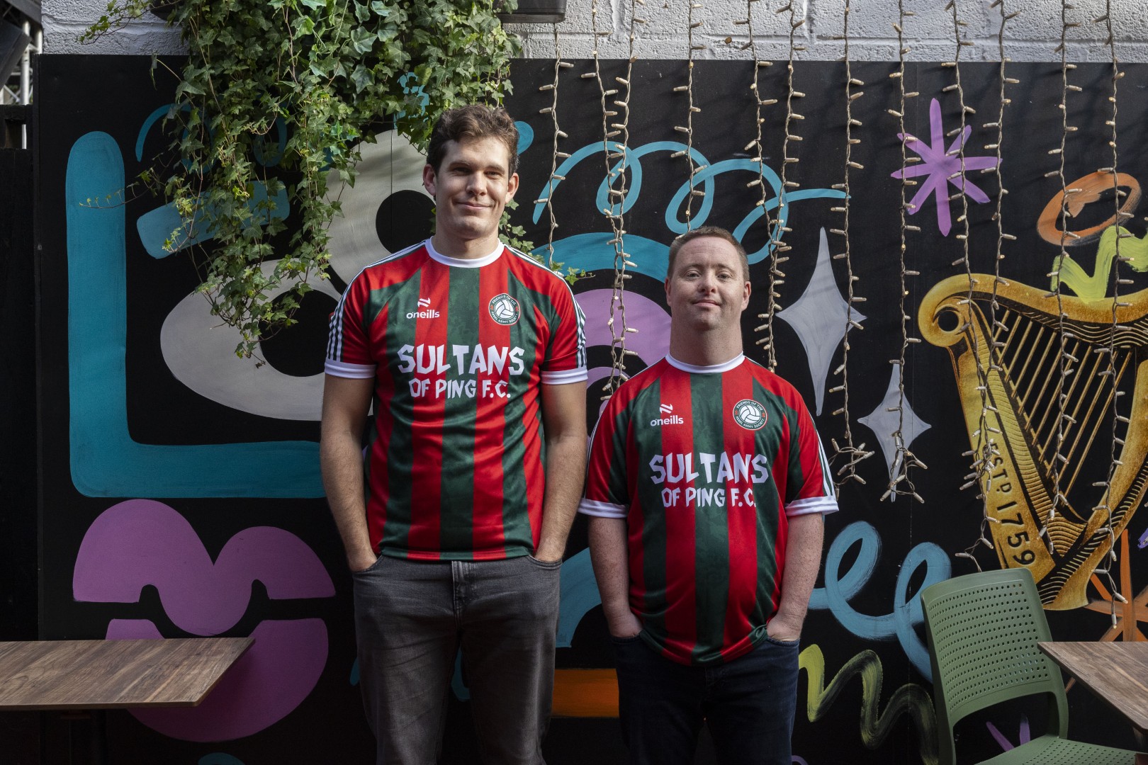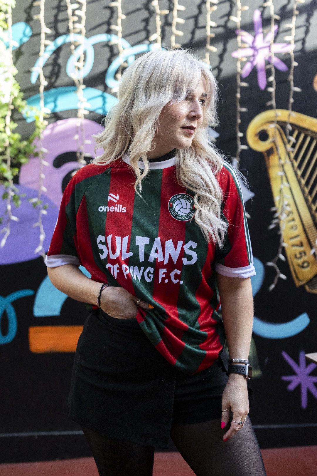 The striped O’Neill’s shirt is Irish-made in the green and red FORAS colours, is emblazoned with The Sultans of Ping logo across the chest and an embroidered FORAS logo as its badge.